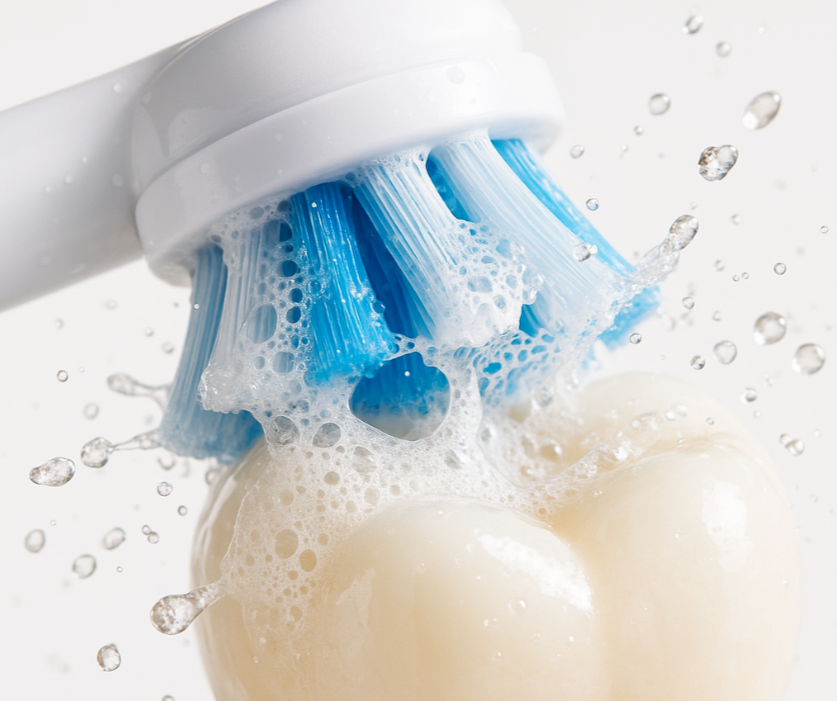 회전식은 작은 원형 칫솔모가 좌우, 혹은 상하로 빠르게 회전하며 물리적으로 플라그를 닦아내는 방식입니다. 치아 하나하나를 감싸듯 닦아내기 때문에 양치 후 즉각적으로 느껴지는 개운함과 매끈함이 가장 큰 특징입니다. 강력한 폴리싱 효과를 생각하시면 이해하기 쉽습니다.