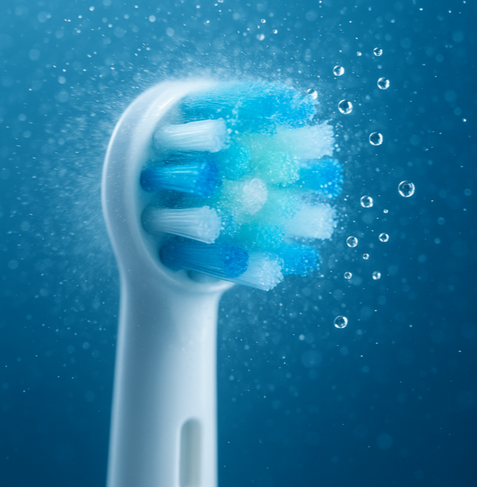 음파식은 칫솔모가 사람의 눈으로는 보기 힘든 미세한 음파 진동(분당 30,000회 이상)을 일으키는 방식입니다. 이 진동이 만들어내는 미세한 공기 방울이 칫솔모가 직접 닿기 힘든 치아 사이사이와 잇몸 라인의 플라그까지 부드럽게 세정합니다. 물리적인 마찰보다는 물의 파동을 이용하는, 부드러운 스케일링에 가깝습니다.