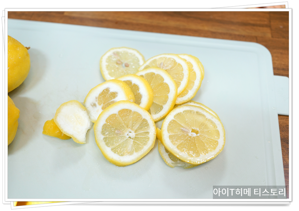 레몬은 얇게 슬라이스하되, 쓴맛의 원인인 레몬 씨는 꼼꼼하게 확인하여 모두 제거해야 합니다.