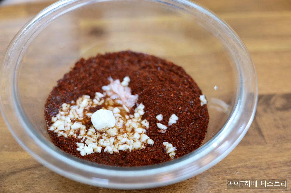 - 비법 양념장: 고춧가루 6큰술, 멸치액젓 3큰술, 새우젓 0.5큰술, 다진 마늘 1큰술, 다진 생강 1큰술, 김장용 육수 1/2컵, 매실엑기스 1큰술